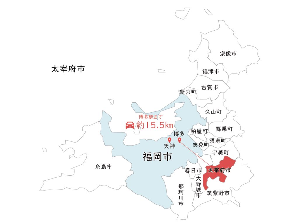 太宰府市から博多駅までは約16kmのため、30分以内で市内へのアクセスが可能です。