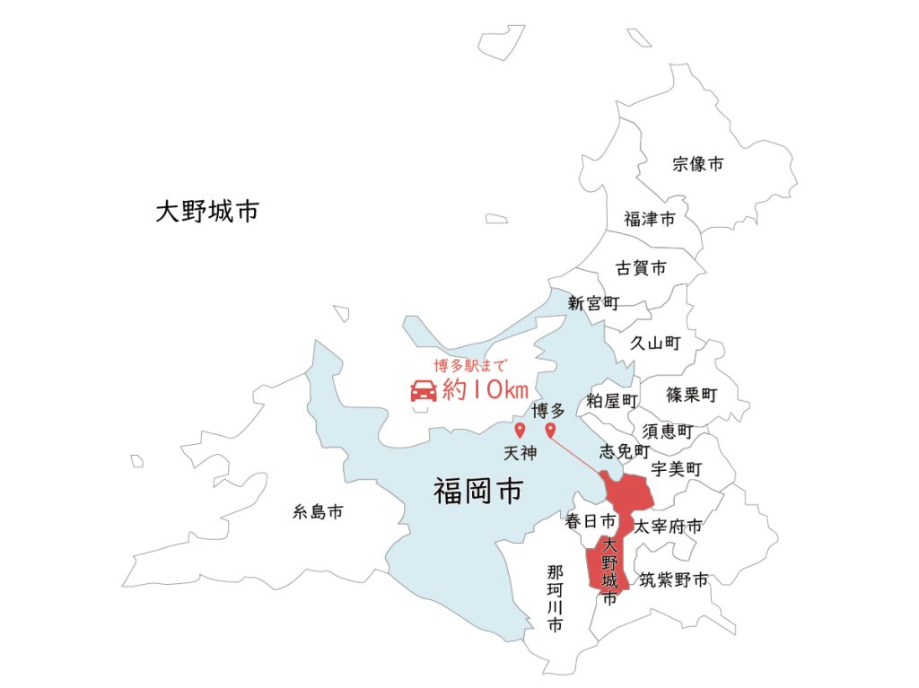 福岡市と春日市の隣にある大野城市は、南北に伸びた細長い地形が特徴です。中心部に都市機能が集まっている一方で、東西は山々に囲まれて自然も豊富。電車やバスのアクセスも良く、通勤・通学にもとても便利です。
