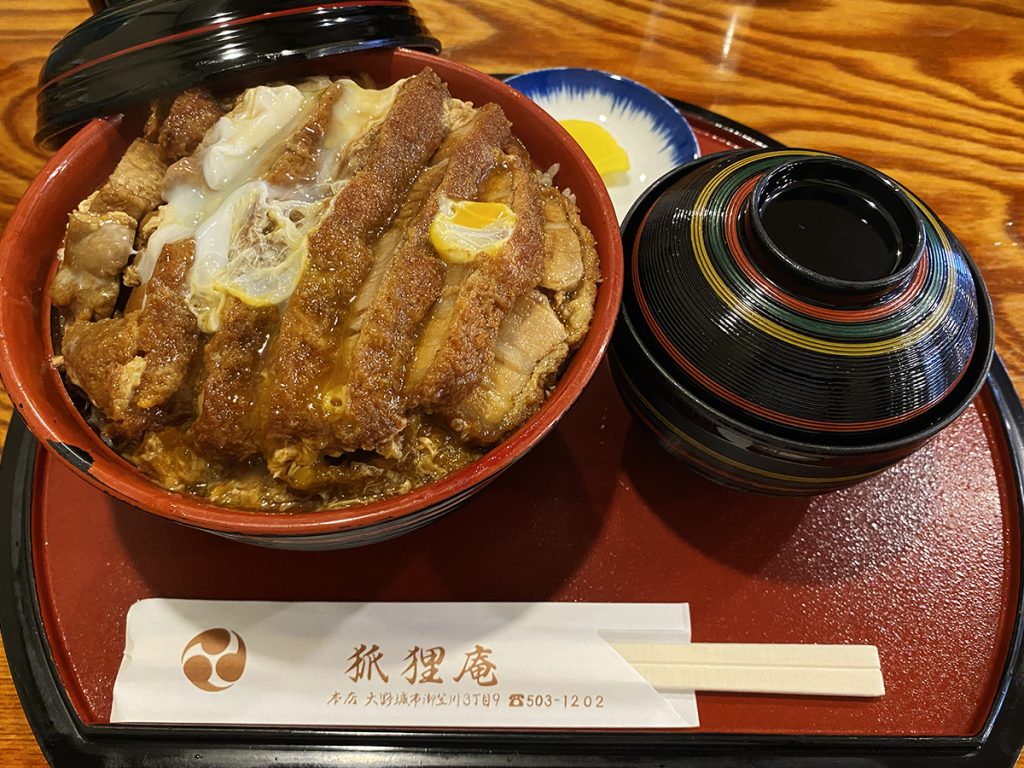 狐狸庵(コリアン)は、趣のあるたたずまいのうどん店なのですが、看板メニューはなんと「カツ丼」です。出汁がしっかり染みた厚さ1cmほどのトンカツに半熟卵がからんで、ご飯との相性が抜群です。
