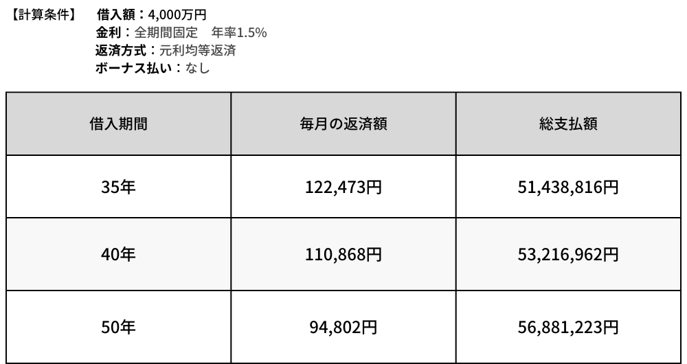 また、35年に設定してしまうと後から40年に延ばすことはできませんが、40年にしておいて35年で完済する分には何の問題もありませんので、最初はなるべく長く借りた方が得策という場合もあります。