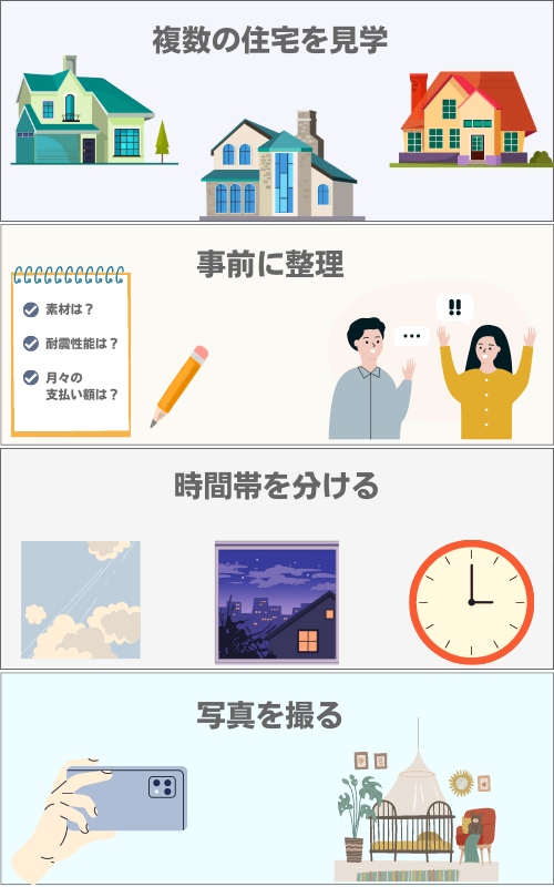 せっかくモデルハウス見学に行くのなら、効率よくマイホームのイメージをつくり上げていきたいですよね。なんとなく見学するだけでは、時間が無駄になってしまうかもしれません。ここからは、モデルハウス見学の機会を有意義なものにするために、見学時のコツを紹介します。